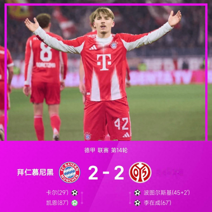 12月15日 25-26赛季德甲联赛第14轮,拜仁慕尼黑坐镇安联球场迎战美因茨。此役上半场,卡尔接应格纳布里横传推射破门助拜仁慕尼黑打破僵局,波图尔斯基接应博文任意球传中头球建功助美因茨扳平比分。易边再战,李在成接应贝尔长传抢点头球破门,凯恩终场前制造点球且亲自操刀主罚命中。全场比赛结束,拜仁慕尼黑2-2美因茨。